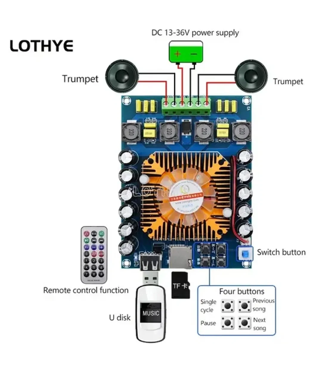 Плата має роз'єм для microSD і USB-роз'єм для програвання музики.